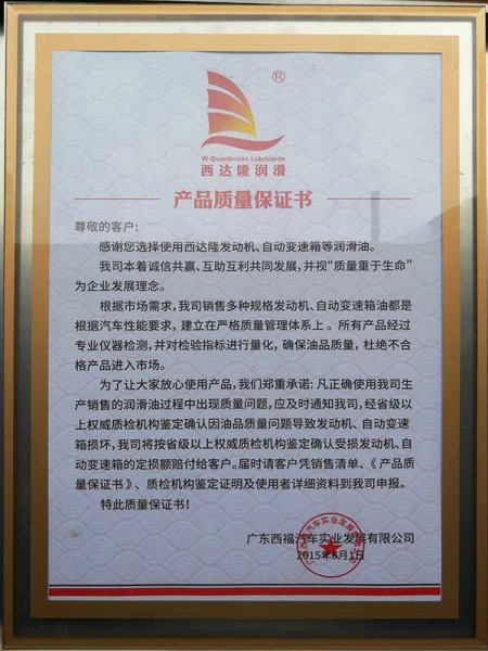 证书编号: 2019 证书名称: 西达隆代理商 发证机构: 广东西福汽车实业发展有限公司 生效日期: 2015年06月01日 截止日期: 2022年06月01日 认证简介: 为了让大家放心使用产品,我们郑重承诺:凡正确使用我司生产销售的润滑油过程中出现质量问题,应及时通知我问,经省级以上权威质检机构鉴定确认因油品质量问题导致发动机、自动变速箱损坏,我司将按省级以上权威质检机构鉴定确认受损发动机、自动变速箱的定损额赔付给客户。届时调请客户凭销售清单、《产品质量保证书》、质检机构鉴定证明及使用者详细资料到我司申报。特此质量保证书!